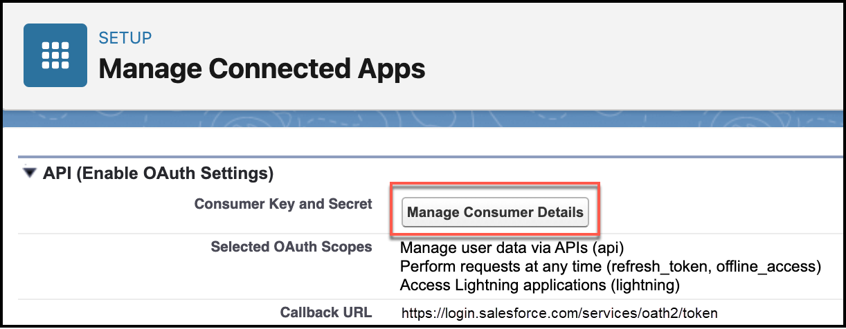 9. Under API (Enable OAuth Settings), for Consumer Key and Secret, click Manage Consumer Details.