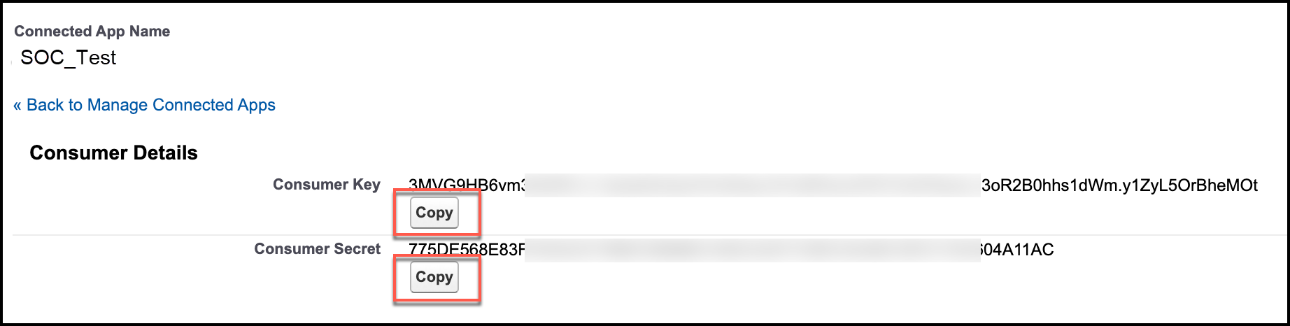 10. Click the Copy buttons to copy and save the Consumer Key and Consumer Secret. You need these for the Stellar Cyber connector configuration,