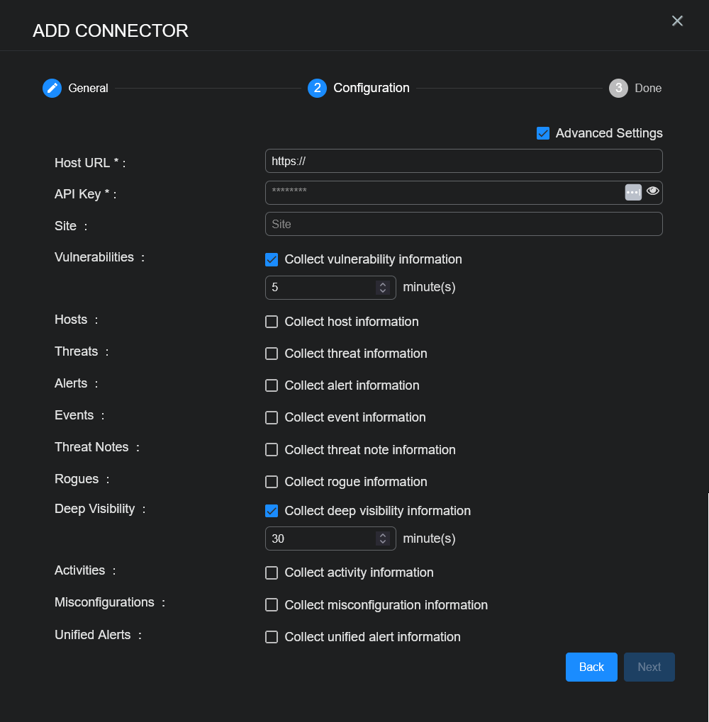 16. Click the Advanced Settings checkbox to enter the interval, in minutes, for each content type selected. The interval is how often the logs are collected. There are default values for the interval, based on the content type. Most content types have a 5 minute default interval, but Deep Visibility has a 30 minute default interval.