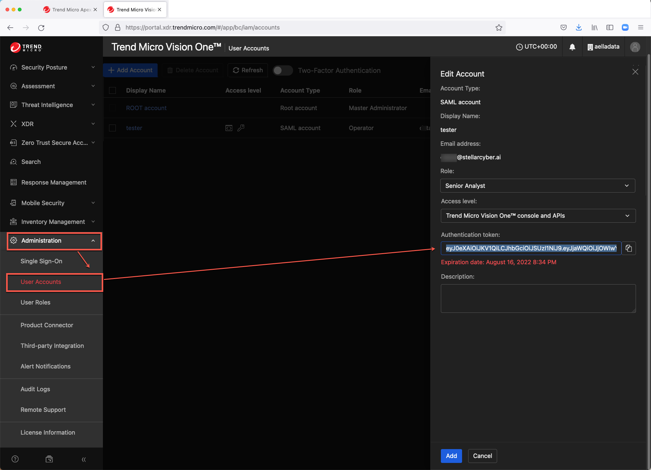 5. Open the user account that will be associated with your Stellar Cyber connector. Make note of the Authentication token.