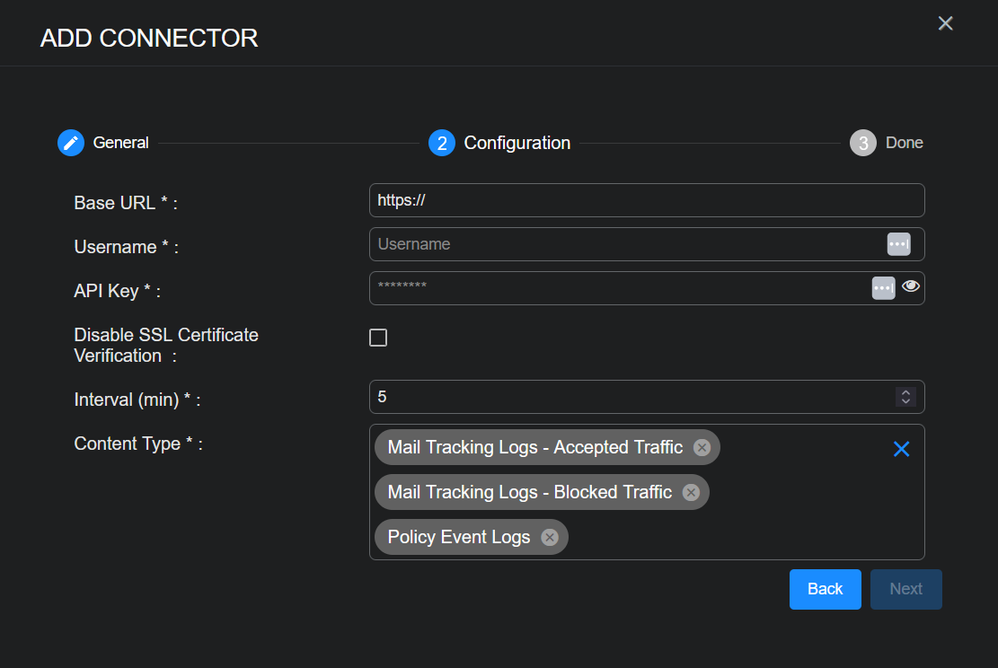 17. Choose the Content Type you would like to collect. The logs for Mail Tracking Logs - Accepted Traffic, Mail Tracking Logs - Blocked Traffic, and Policy Event Logs are supported.