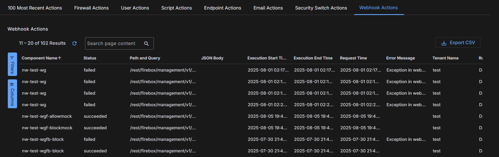 You can view the action status or error message in the table.