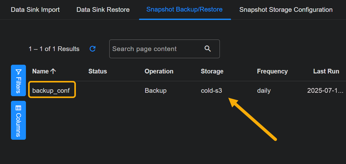 Find the job that backs up configuration data for the primary DP and take note of the name in the Storage column. For example, in the figure below, the backup_conf job backs up configuration data regularly to cold-s3.