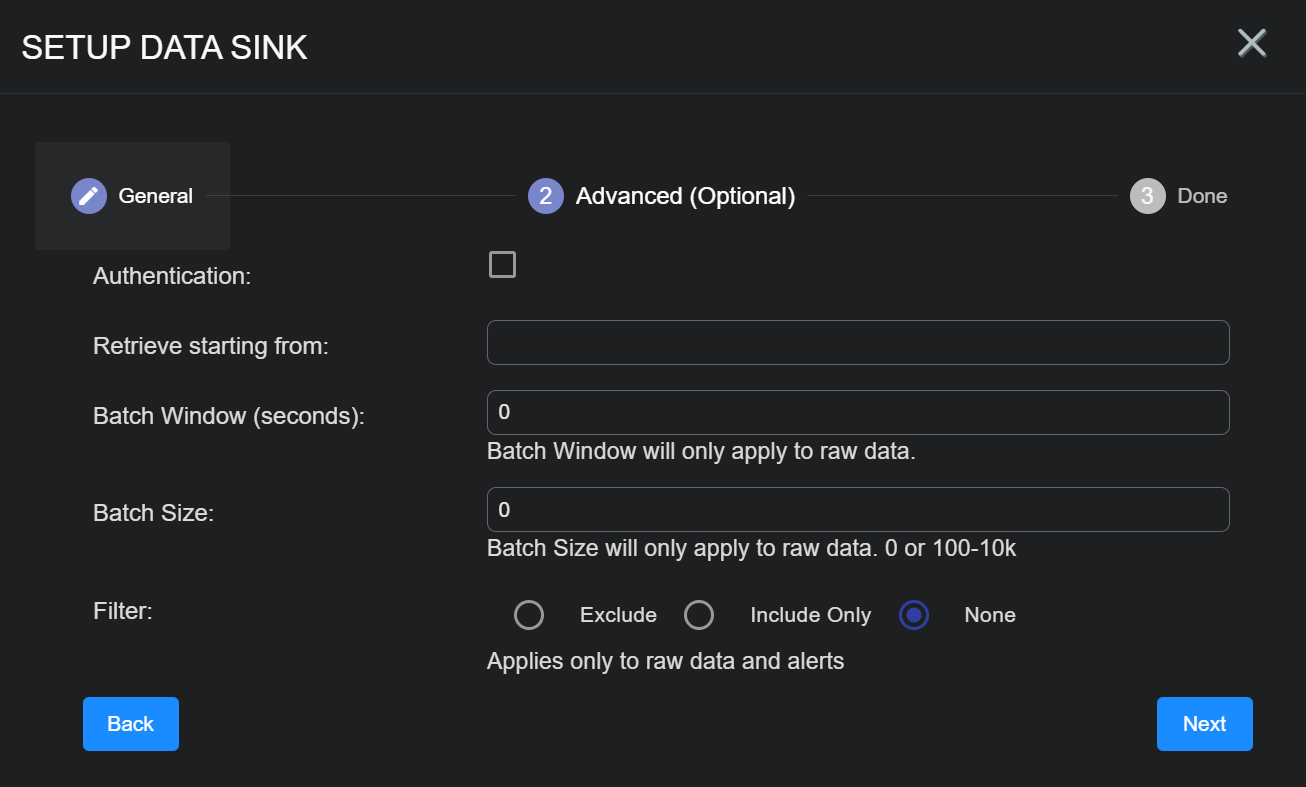 Stellar Cyber batches data to the Data Sink depending on whichever of these parameters is reached first.