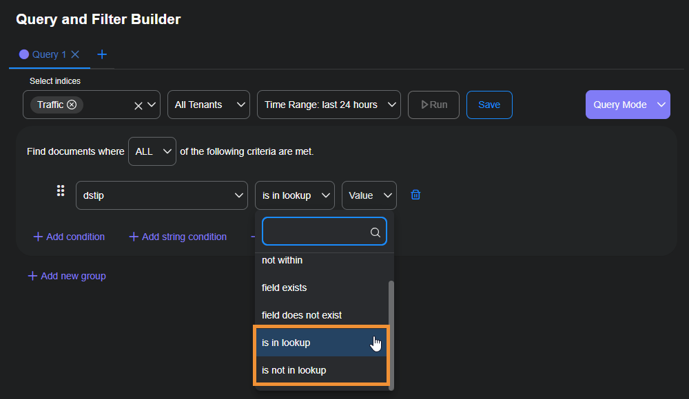 This lookups feature (System | Saved Objects | Lookups) allows you to centrally create and manage lists of IP addresses, text strings, dates, or numbers for conditional matching in queries and alert filters that you create and edit in any of the query and alert filter builder tools such as: