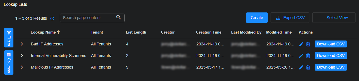 The table has common behaviors to all tables in Stellar Cyber, including column management, sorting, editing, or deleting. The Export CSV button at the top of the table is used to export the whole table as a list. Each row, however, includes a button that allows you to Download CSV formatted list for archive and editing offline. You can edit the list and reimport it, or edit it manually.