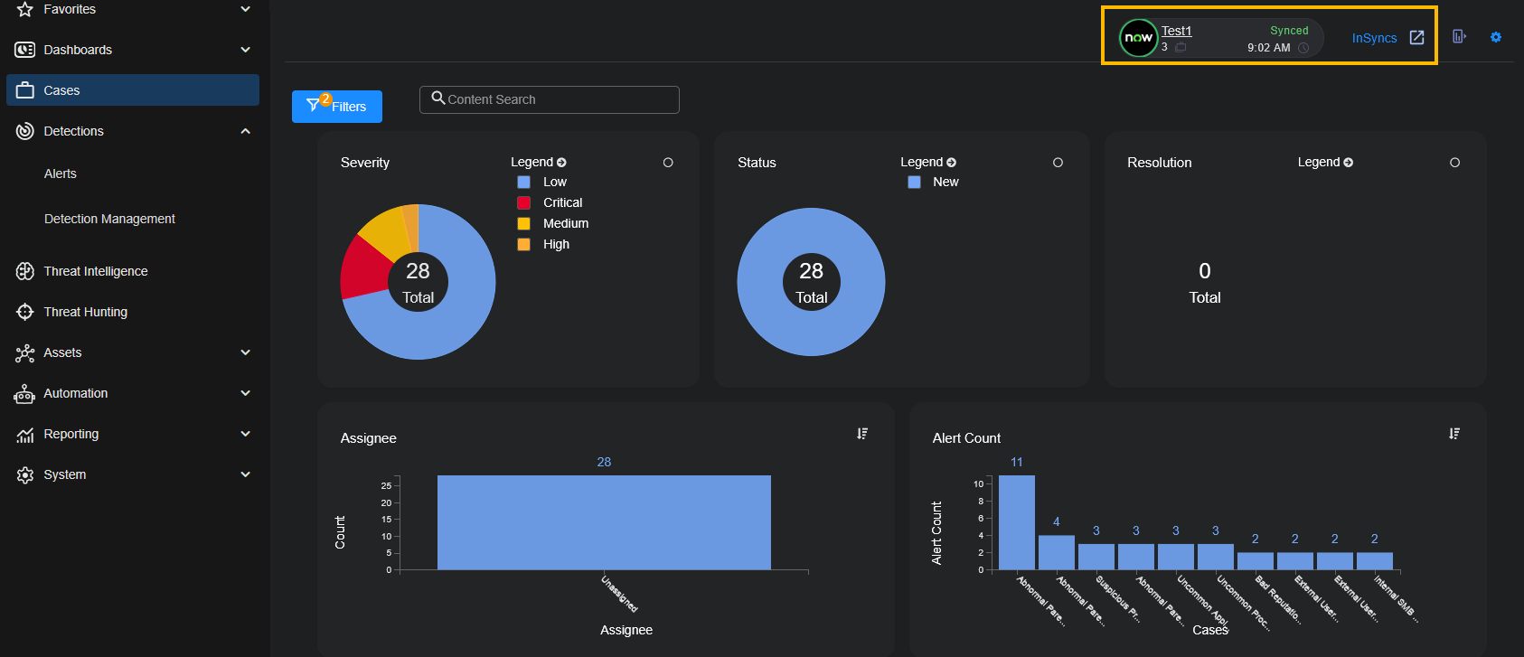 Click Cases to go to the Cases page. At the top of the page, there is a status indicator for the integration syncs as well as a button you can click to go back to the InSyncs page.
