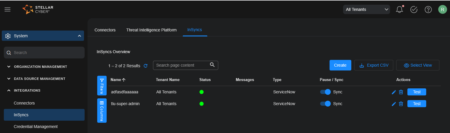 Synchronizing an alert or a case from Stellar Cyber to ServiceNow is fully automated. It is based on the configuration detailed in Configuring InSyncs. As an example, during configuration you select the tenant that you want to synchronize, then, if there is a new alert or a new case belonging to that tenant, it will be synchronized with ServiceNow automatically.