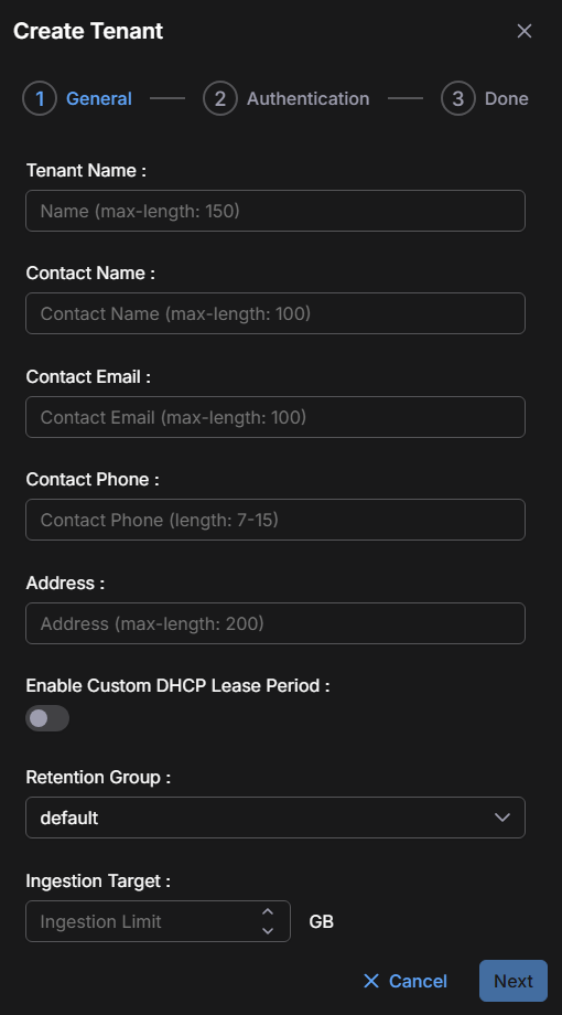 • Ingestion Target – Use this field to create a target ingestion limit for this tenant. The value you specify here is for your reference only and is not enforced.