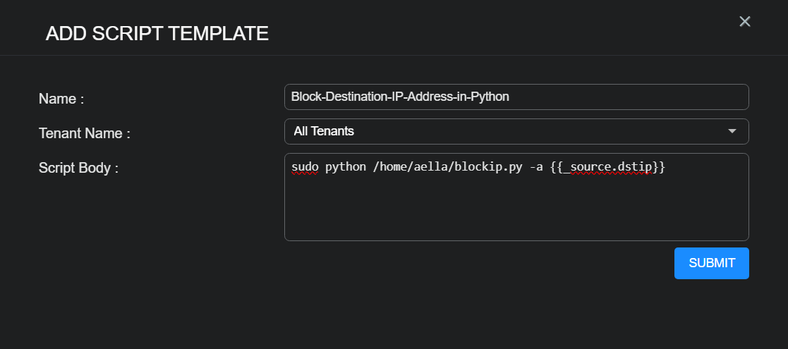 To create a saved script to block a destination IP address, we create a Python script to generate the email, and then call that script from Stellar Cyber.