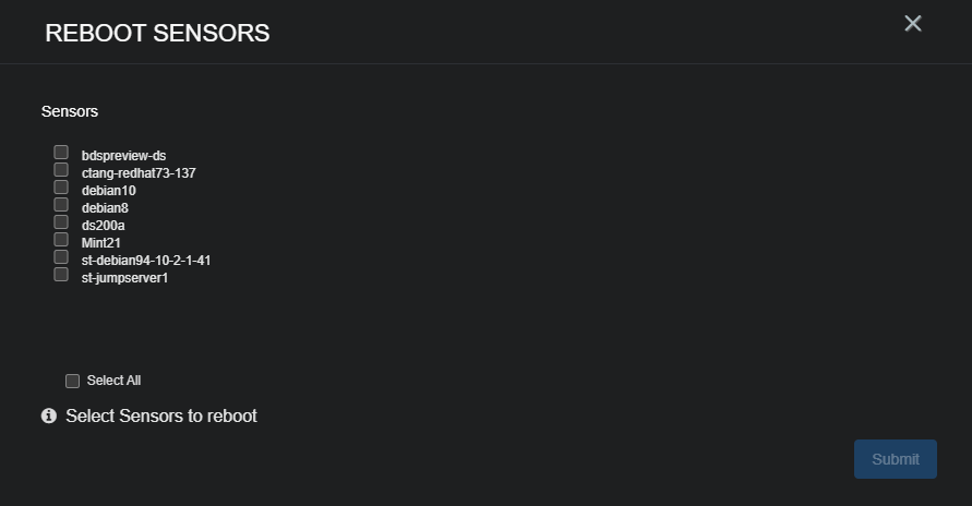 Select the sensors to reboot by checking their boxes in the SENSORS list and then select Submit to start the reboot process on the selected sensors.