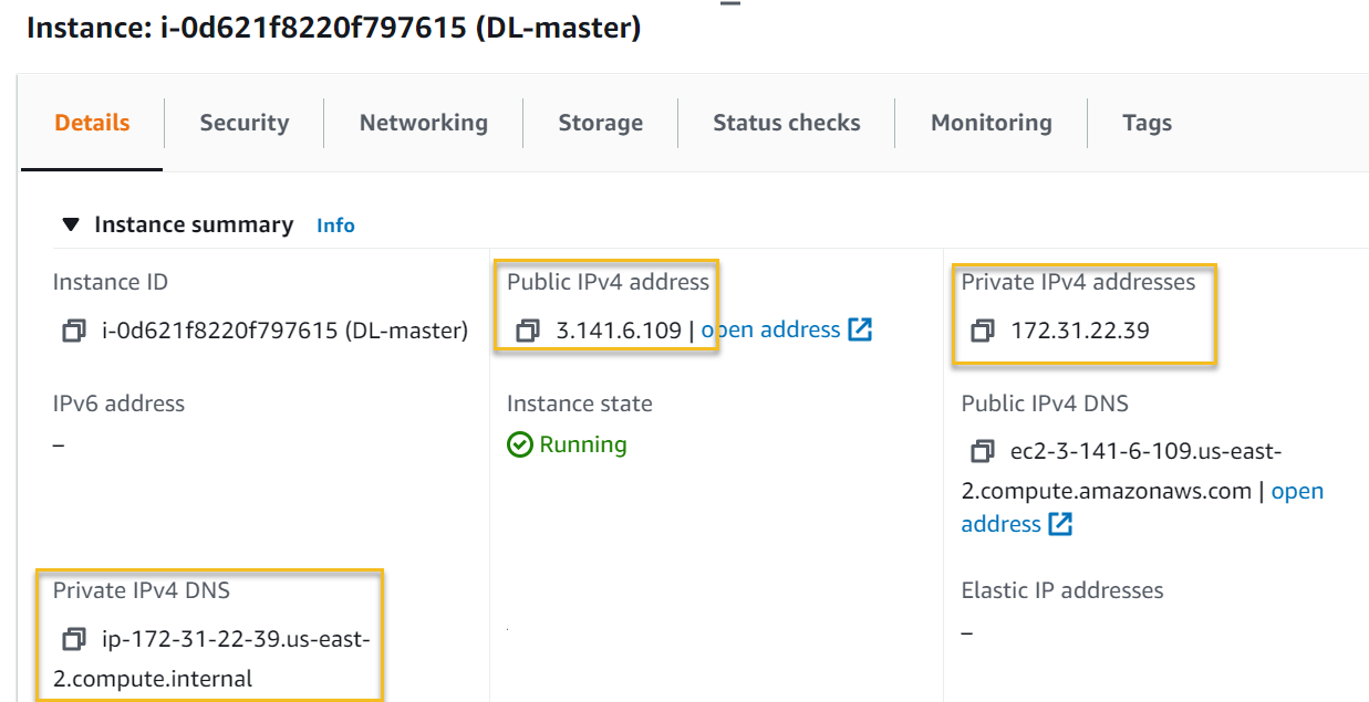 - Copy the Public IP, Private IP, and Private DNS.