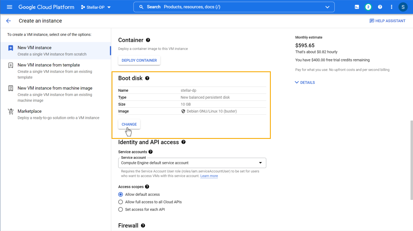 7. Scroll down to the Boot disk section and click the CHANGE button.