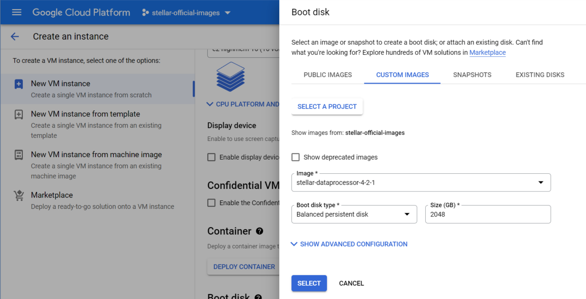 10. Click the SELECT A PROJECT button and choose the stellar-official-images project.