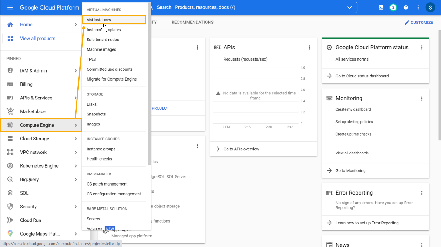 2. Select the Compute Engine | VM instances entry from the left navigation panel.