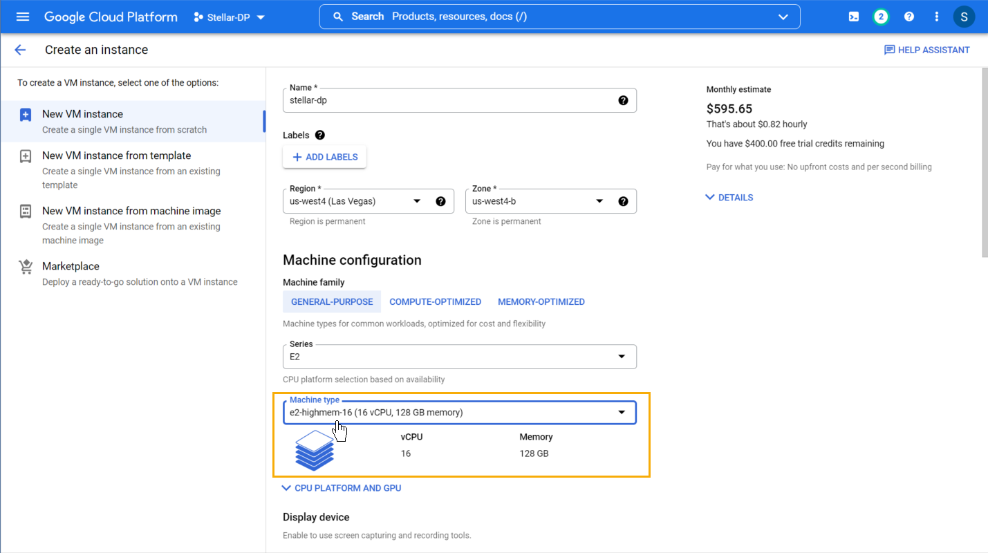 6. Choose a Machine type for the instance that provides at least 16 vCPUs and 128 GB of memory. Stellar Cyber recommends choosing a Machine type of e2-highmem-16 or better, as illustrated below: