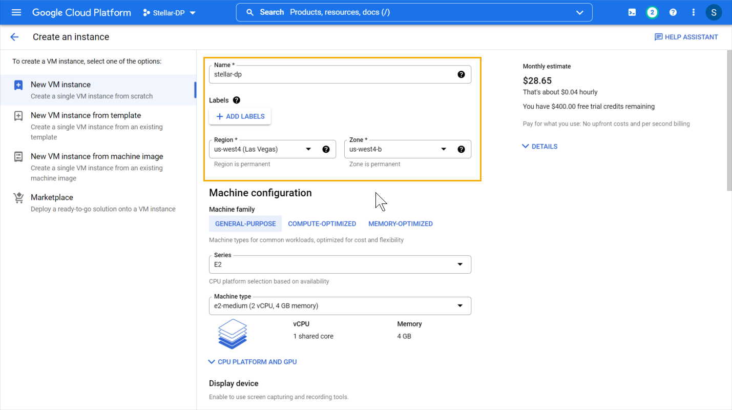 5. Supply a Name, Region, and Zone for the instance.