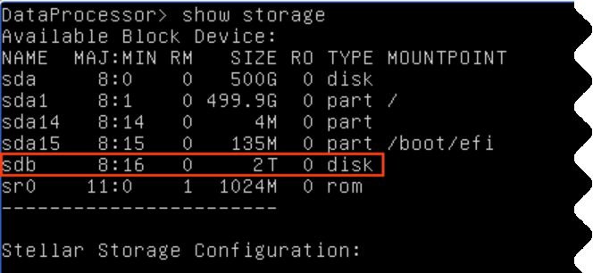2. Verify that the new storage is available with the show storage command. The example below shows 2 TB available on sdb.