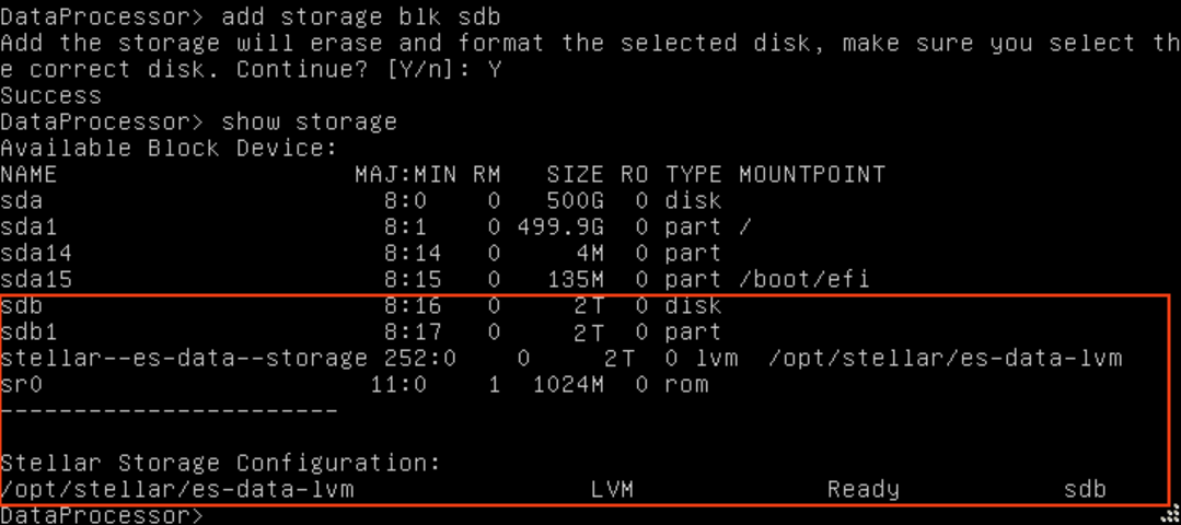 3. Use the add storage blk <bulk storage name> command to add the new disk for use by Elasticsearch. For example, using the sdb disk in our current example: