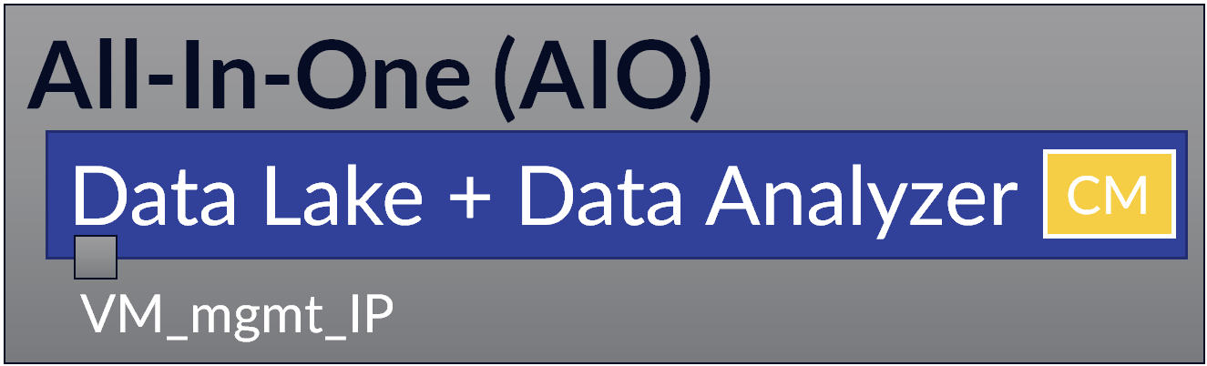 All-In-One (AIO) – AIO deployments use a single VM to host both the DL and the DA. This model only supports daily ingestion up to 50 GB and is not recommended for most use cases because it does not does not provide the efficiency and scalability of installing components on separate VMs. Stellar Cyber recommends either the standard or cluster model.