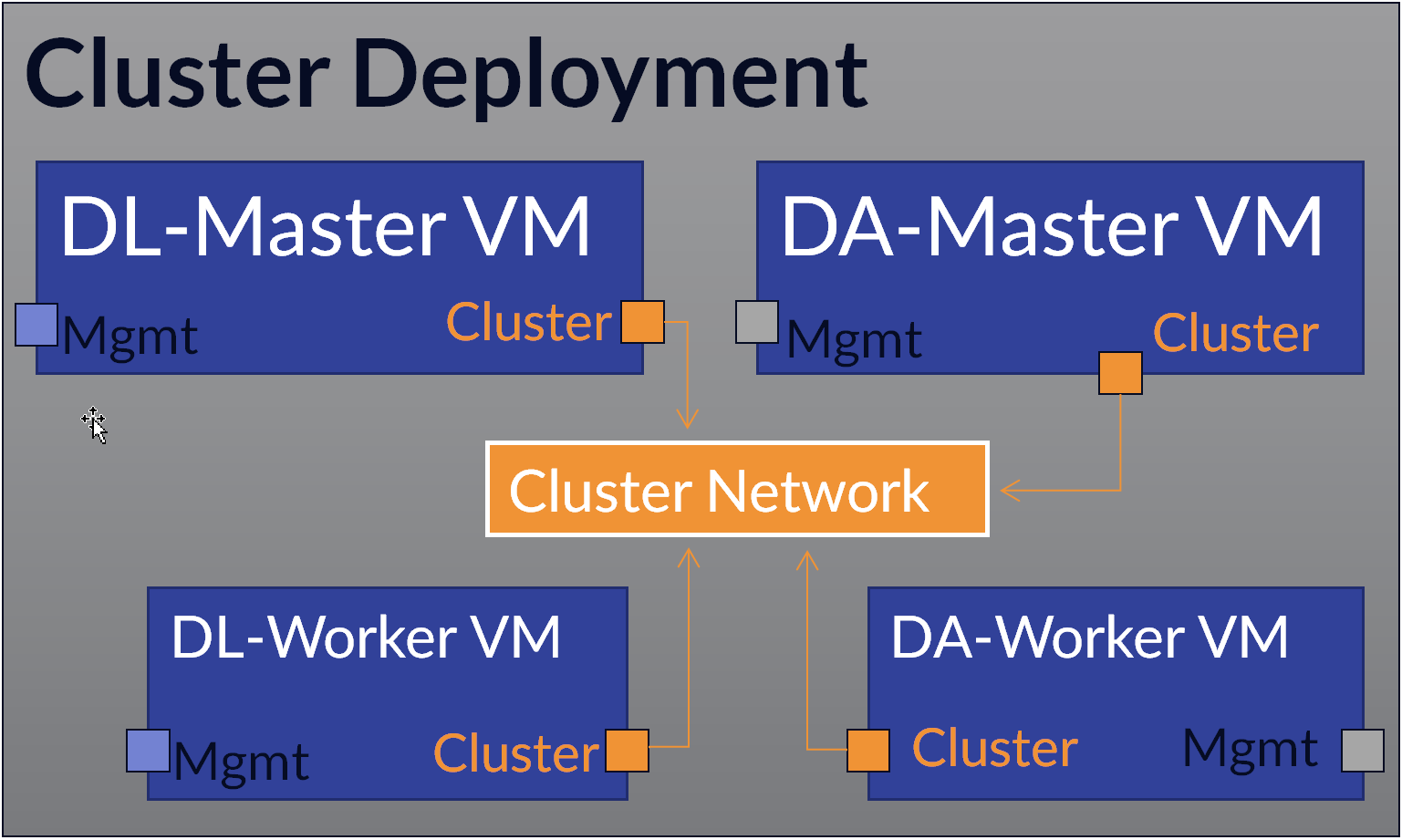 Cluster – Cluster deployments scale up performance by adding additional DL-Worker and DA-Worker nodes to share the workload. Worker nodes communicate with the cluster using a dedicated cluster network. The table in Minimum System Requirements provides the counts of DA and DL nodes you need to deploy for different ingestion capacities.