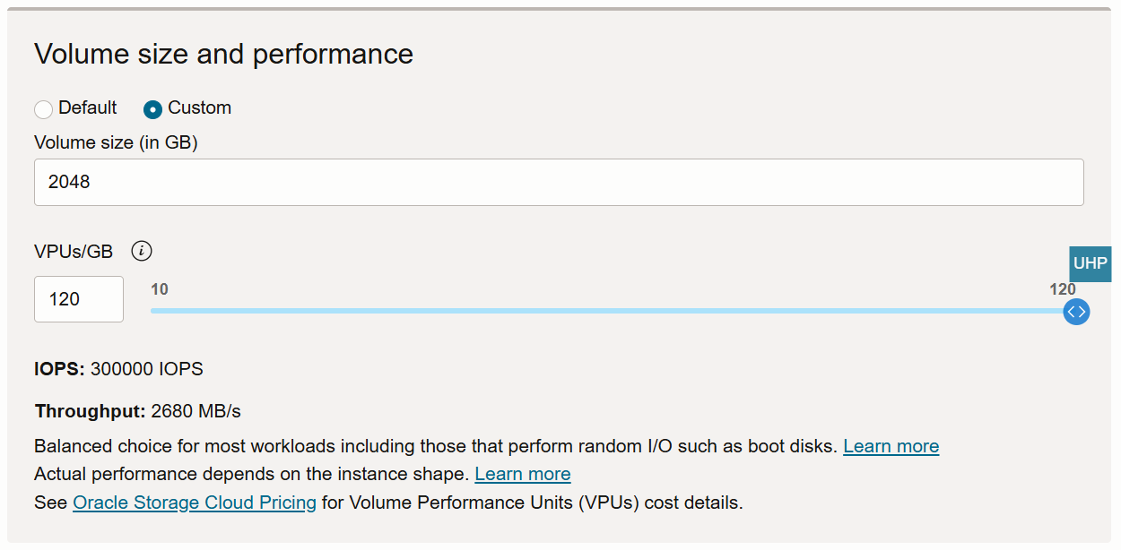 In the Volume size and performance options, select the Custom option.