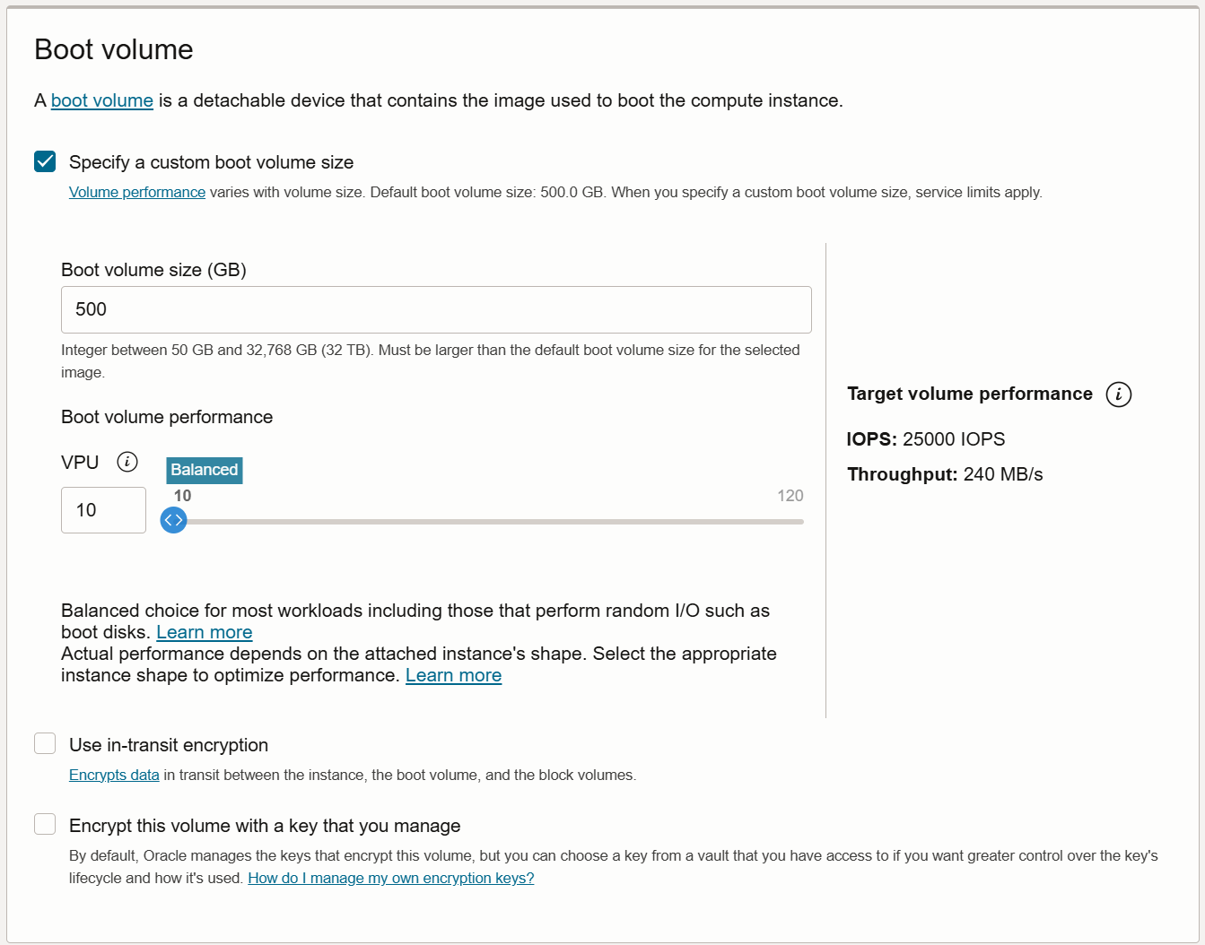 Check the Specify a custom boot volume size option and specify a size of 500 GB.