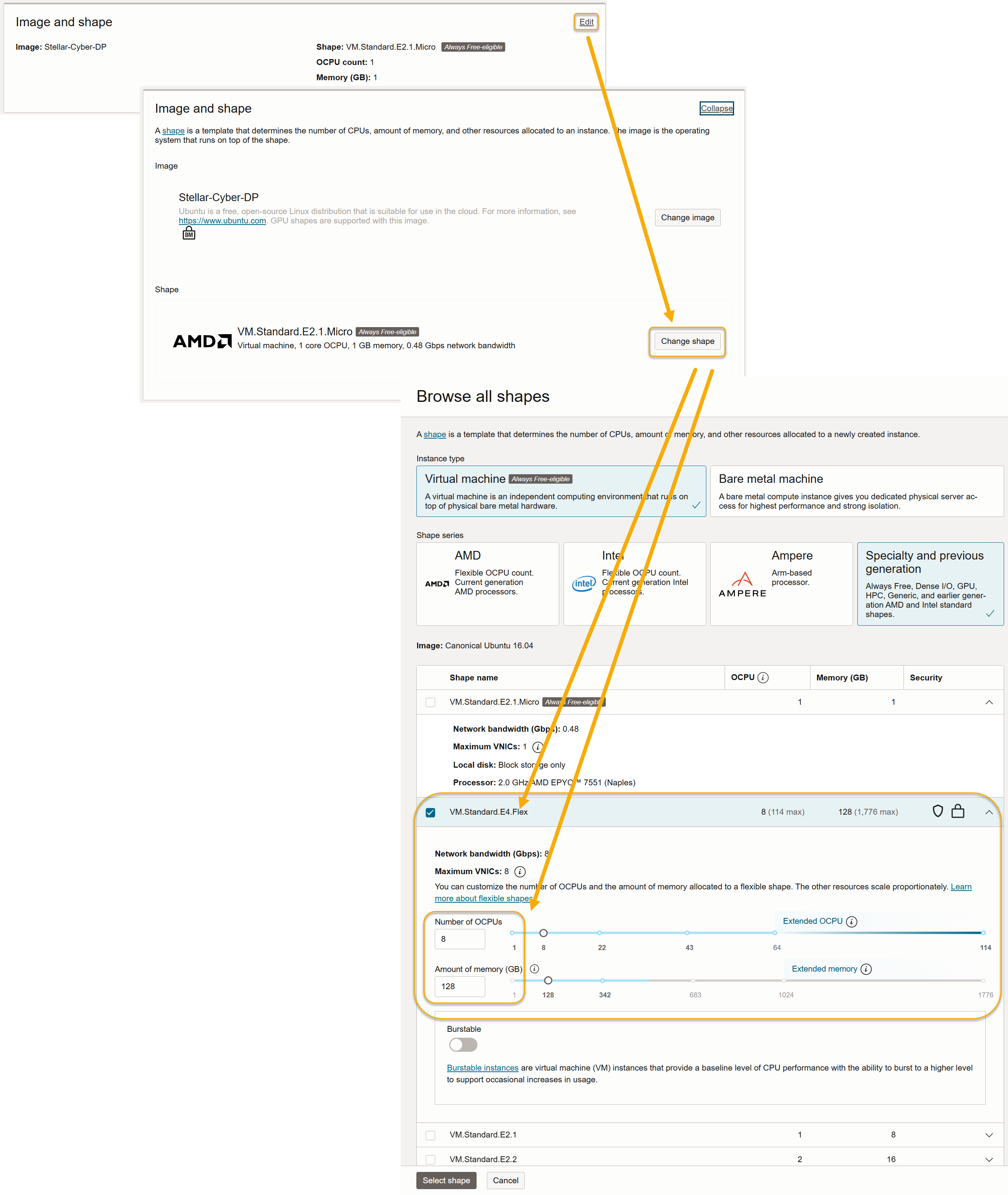 You can click the Edit and Change shape buttons in the Image and shape pane to select and provision the shape. For example, here's a VM.Standard.E4.Flex shape provisioned to operate as a DL-worker: