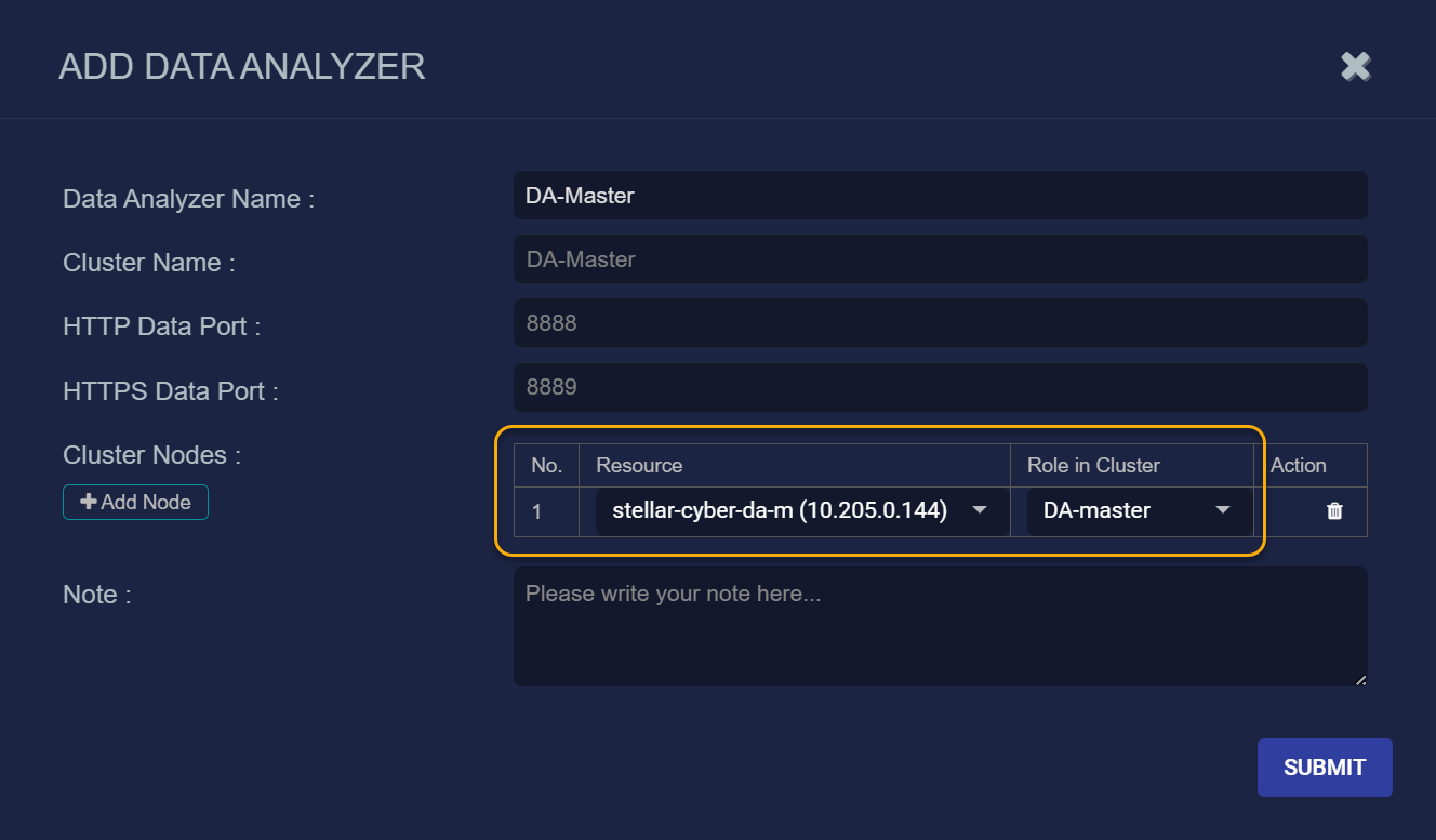 Cluster Nodes – Click the Add Node button and use the Resource dropdown to select the da-master. Then, set the Role in Cluster dropdown to DA-Master and click Submit, as in the figure below.