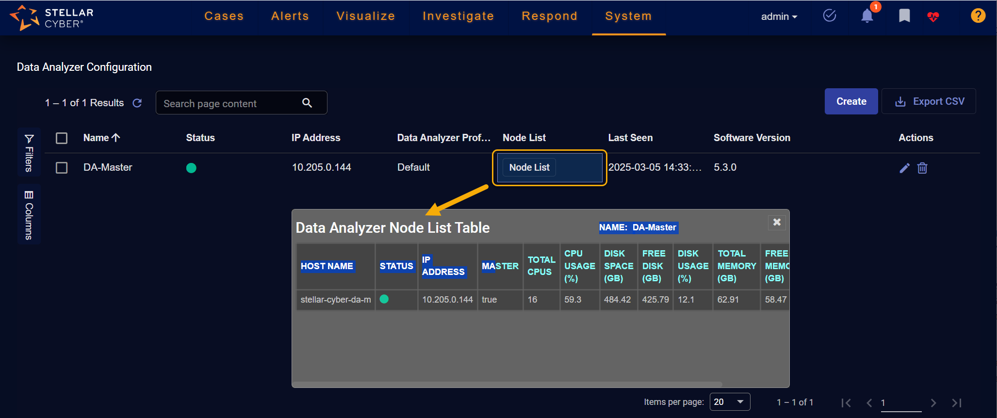 Navigate to the System | DATA MANAGEMENT | Data Analyzer page and click the Create button to create a new DA cluster.