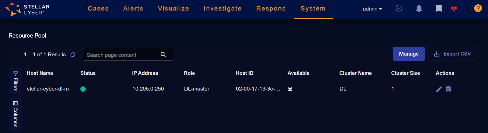 Navigate to the System | DATA MANAGEMENT | Resources page and verify that the DL-m VM is listed with a Role of DL-master and the Cluster Name you specified in the CLI. For example: