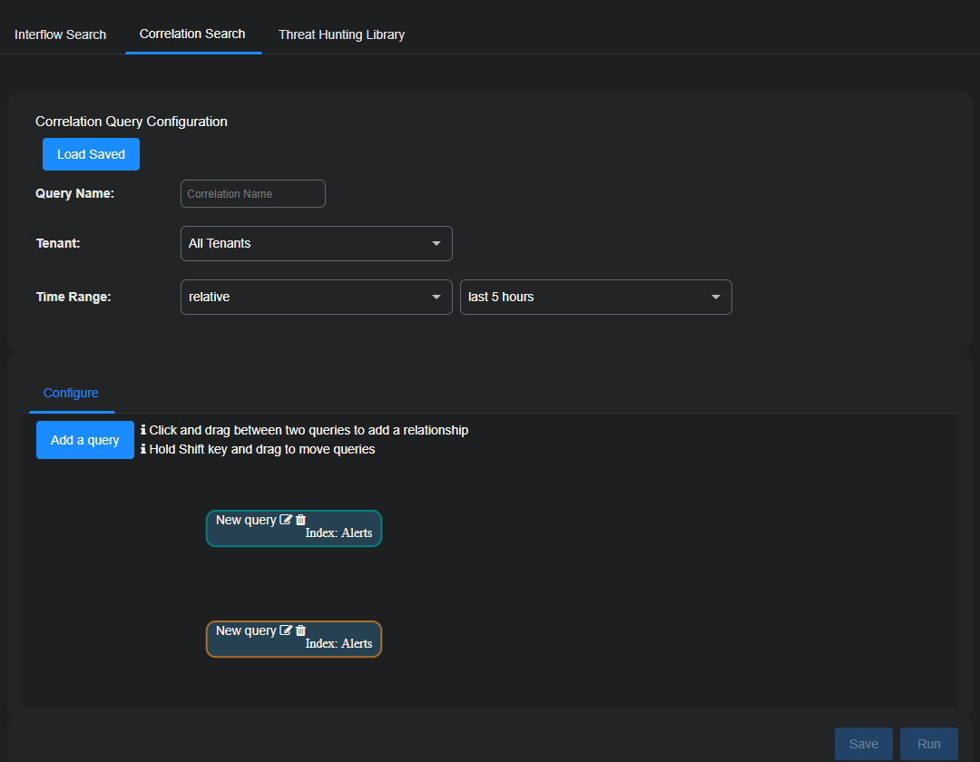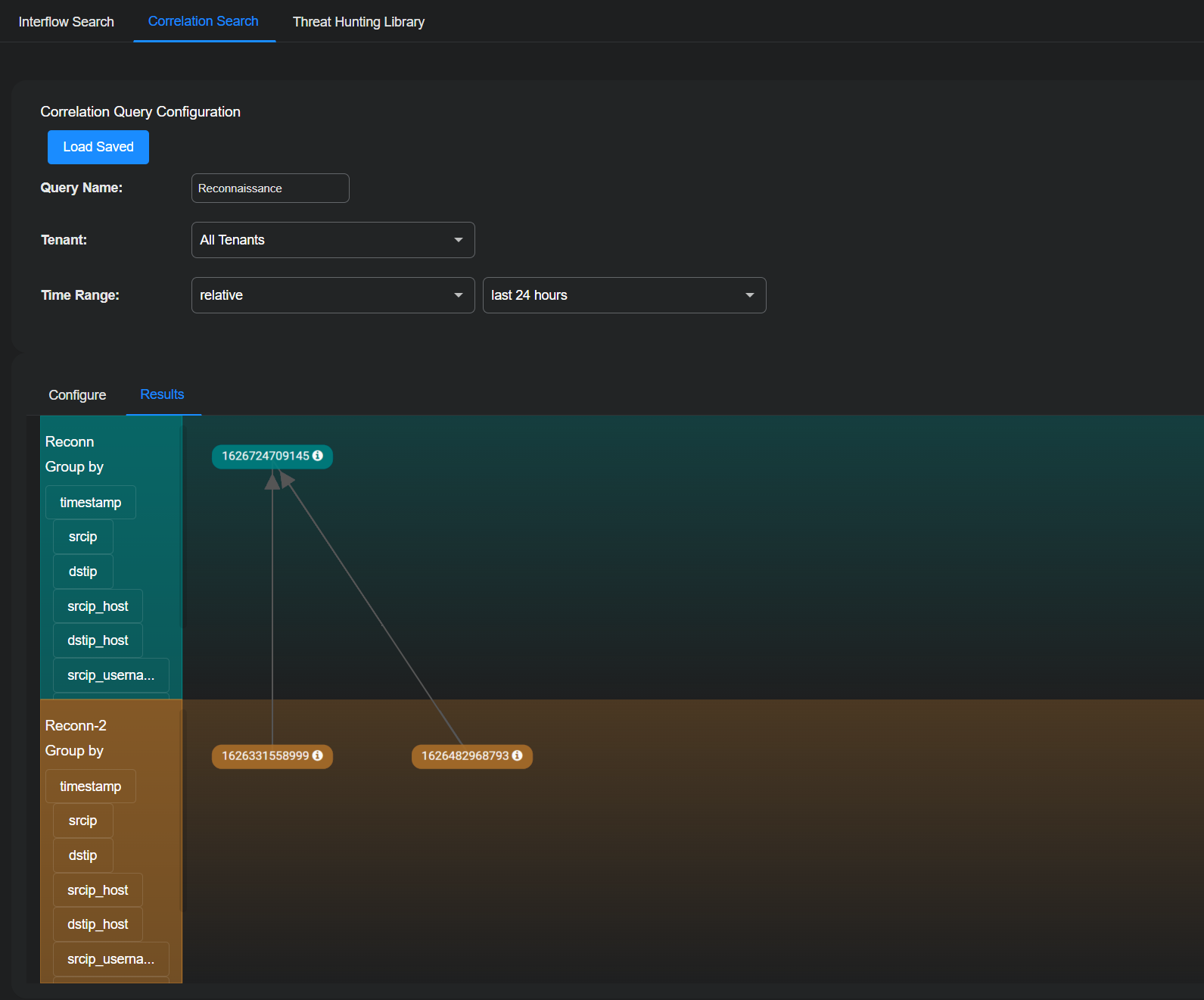 To run the correlation query configuration that you made at a later time, select Threat Hunting | Correlation Search | Load Saved, choose it in the Select Pre-Defined Template list, and select Submit and then Run.