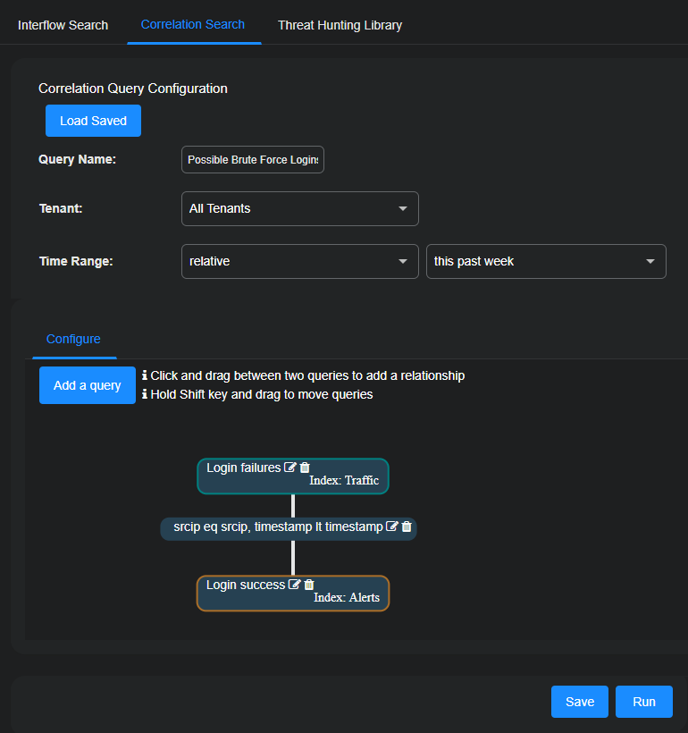 In short, the correlation query contains one query that identifies user accounts with a high volume of events within a given time window. The second query examines logs for unusual or suspicious behaviors (failed logins, file access anomalies, access from new devices) or activity from unusual geolocations or unusual IP addresses. The two queries are linked together by the same source IP address.