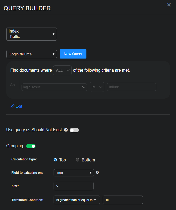 10(This checks the top five groups and then retains only those groups with at least 10 records. For example, if the top five groups have 14, 13, 10, 7, and 6 records respectively, after Stellar Cyber applies the threshold condition, it retains the three groups with 14, 13, and 10 records. Stellar Cyber then keeps the most recent record in each of these three groups and uses it to query if there’s been a successful login from the same source IP addresses and if it occurred after all the failed login attempts.)