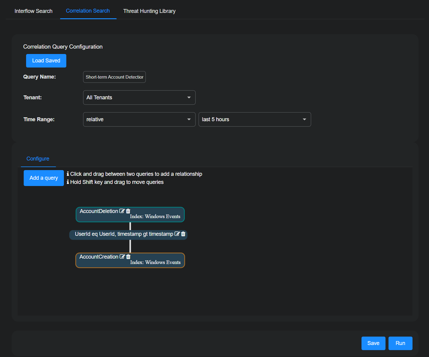 The query checks records in the Windows Events index for account creations within the past two days. For each user account created during the last two days that correlates to an account deleted in the past five minutes, Stellar Cyber generates one record.