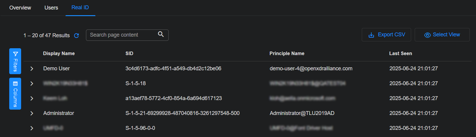 The Real ID dashboard shows a table of users with all of their various identities. The identities are imported from Active Directory and correlated with a single SID. That SID is used to link all user identities.