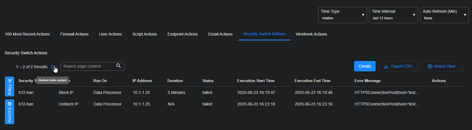 The action goes into effect immediately and appears in the Security Switch Actions table.